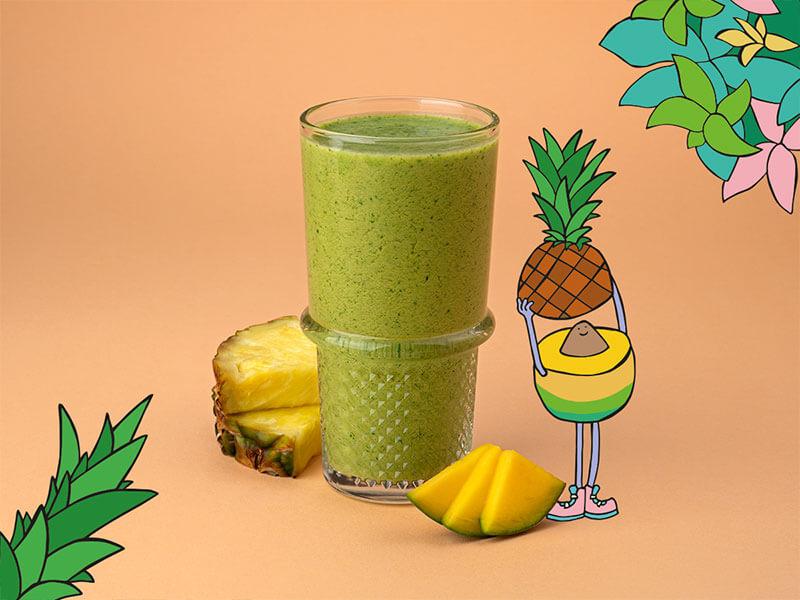 Las espinacas y las frutas tropicales se mezclan torpemente bien juntas. Es como si la espinaca dijera "¡Sé saludable bastardo!" y las frutas tropicales dicen "Disfruta de nuestras dulces sensaciones, amigo". Sí, así como así. En tu boca.